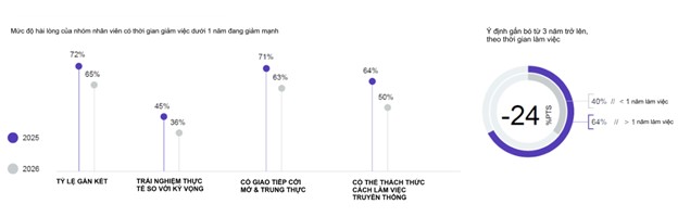 Một trong những điểm đáng báo động nhất là sự sụt giảm mạnh mẽ về tinh thần của những nhân viên có thâm niên dưới một năm. Nếu như vài năm trước, khái niệm "kỳ trăng mật" của nhân viên mới bắt đầu biến mất, thì đến năm 2026, giai đoạn này đã trở nên "cay đắng" hơn bao giờ hết. Nhân viên mới cảm thấy ít được gắn kết và cam kết với tổ chức hơn hẳn so với các đồng nghiệp lâu năm. Họ thiếu đi sự giao tiếp cởi mở, trung thực từ phía công ty và ít có cơ hội để đóng góp ý kiến hay cải tiến các quy trình cũ. Tình trạng này đặc biệt nghiêm trọng tại các doanh nghiệp quy mô lớn (từ 5.000 đến 10.000 nhân viên).